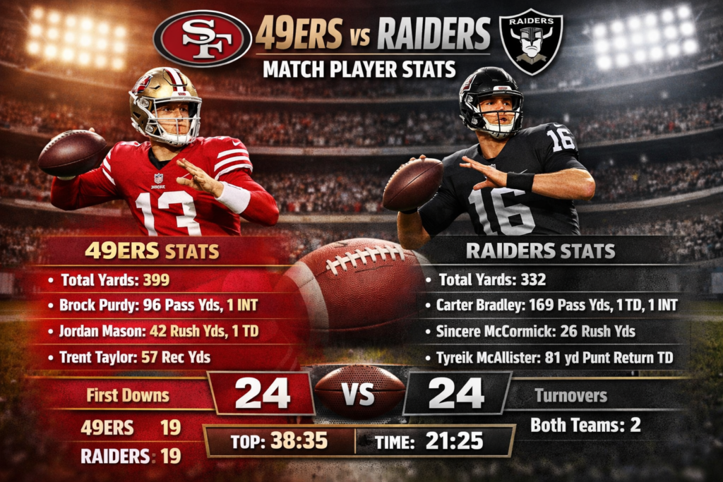 The 49ers vs Las Vegas Raiders matchup showed balanced performance from both teams. The game had strong quarterback play, good rushing balance, and exciting special teams moments.