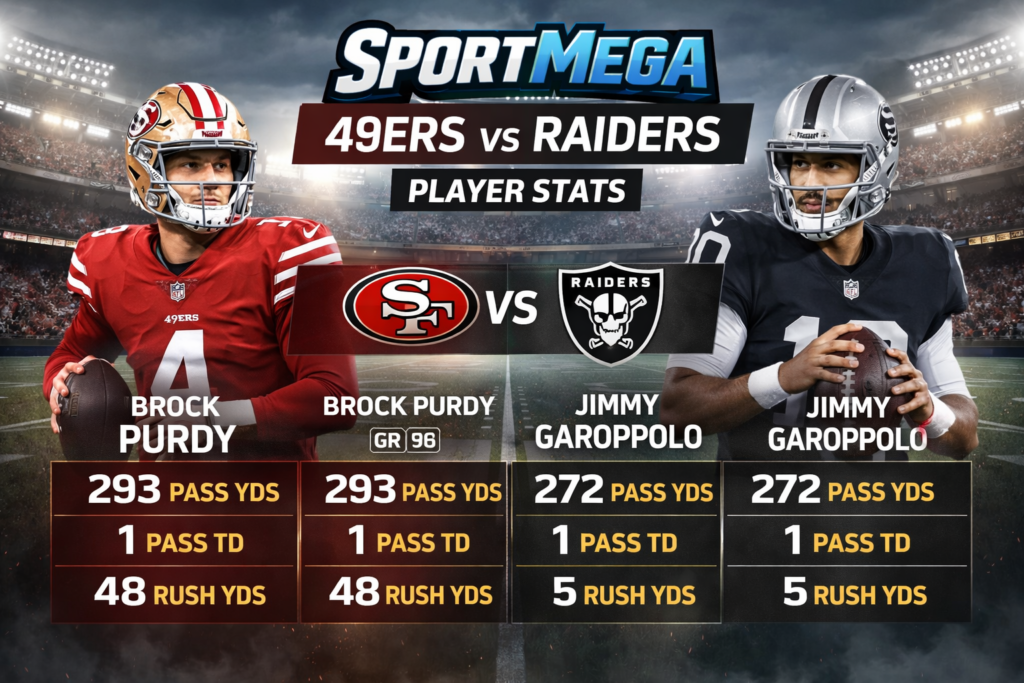 The San Francisco 49ers and the Las Vegas Raiders are two well known teams in the NFL. When these teams play against each other, fans always expect an exciting game. Many people like to study player stats from these games because stats help us understand how players performed and how the game was won or lost.
