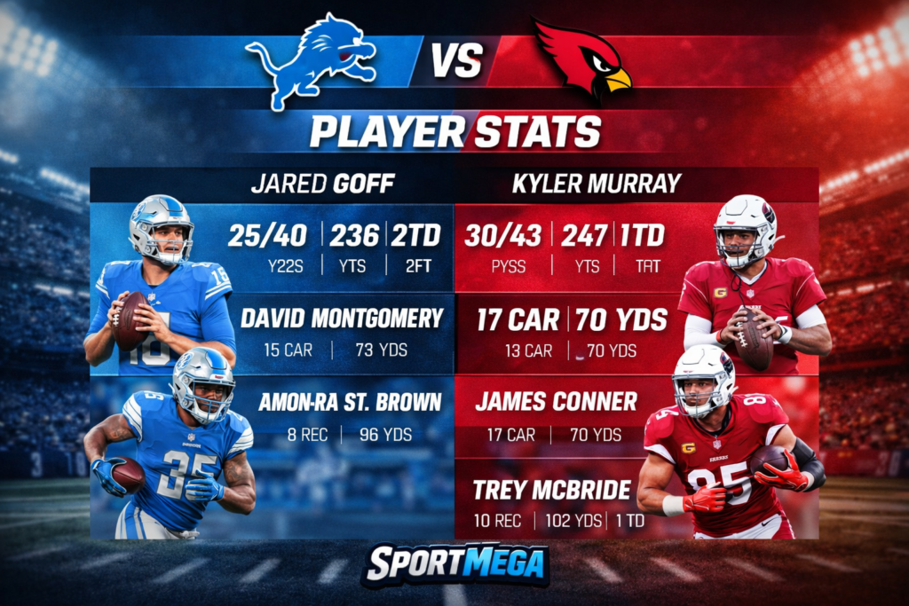 The Detroit Lions vs Arizona Cardinals match player stats tell the story of a close but controlled game. Detroit used a strong rushing attack, efficient quarterback play, and solid defense to win 20 to 13.