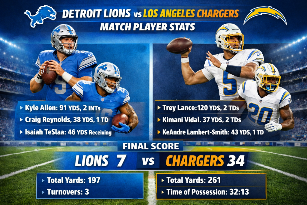 The Detroit Lions vs Los Angeles Chargers match player stats tell a clear story. The Chargers played a clean and effective game. Their offense, defense, and special teams worked well together.